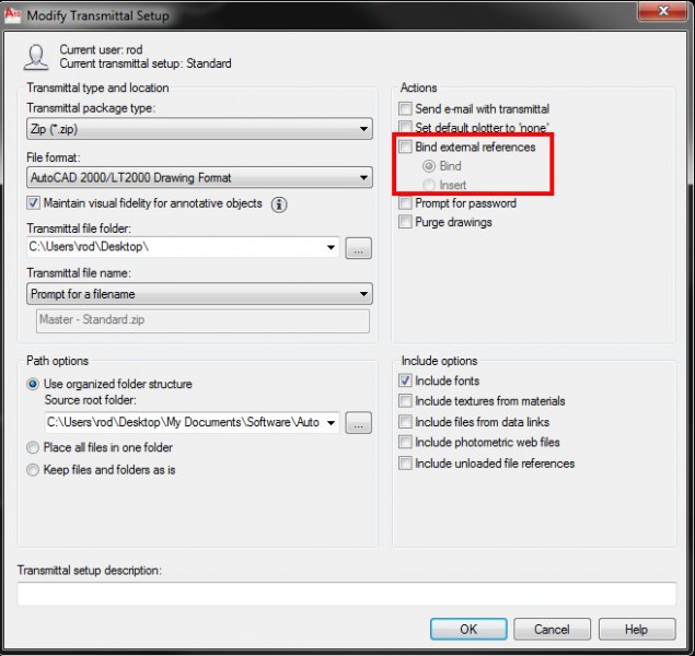br0604bom Posted July 24, 2010 Author Posted July 24, 2010 I don't have 2008 on this machine, so the screenshot below is from 2010. Is the "Bind" option not available in your Etransmit settings? thanks for getting back in touch cad 64, I have just tried it again and made the change in the transmittal set up, just needed bind into one drawing clicked on, thanks very much again Quote