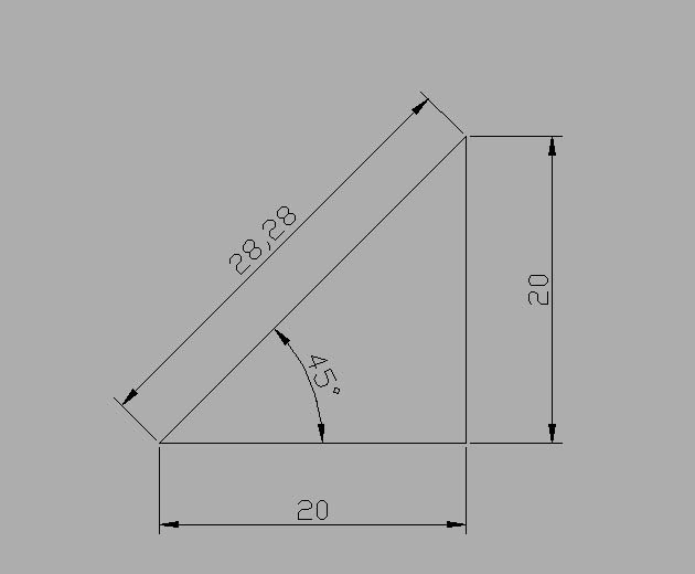XuFyan Posted August 16, 2010 Author Posted August 16, 2010 Thanks Eldon As the 'legs' are equal (20x20) the angles are 45 deg. (45, 135, 225, 315)Ever heard of Pythagoras? This is basic geometry and you should have a grasp of this if you are going to be drafting. how did you determine the legs are (20x20) and how did you determine the angles are 45 deg ?? i know the pythagorus theorem but how to implement it in this figure ??? (sorry ,i am asking very silly questions ) Quote