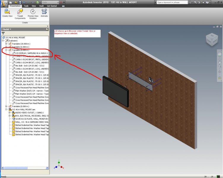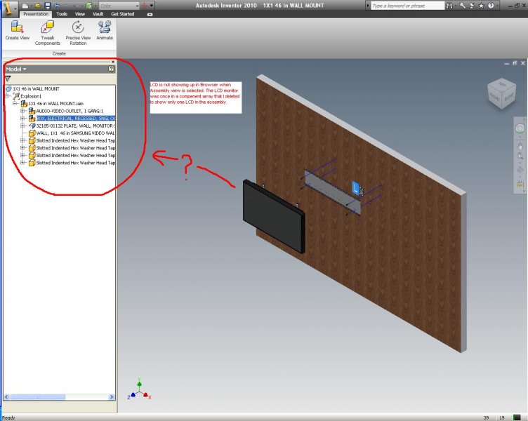 ecshclark Posted August 17, 2010 Posted August 17, 2010 I have a video wall with 3 LCD monitors in an assembled array, and made an assembly drawing using an ipn file to explode the assembly. I then created an assembly drawing with only one monitor, by copying the files, and deleting the array for the single monitor assembly drawing. Now the LCD monitor is not being listed in the Browser when Assembly View is selected, but it shows up in the Tweak and Sequence views. The monitor is at the top level of the assembly heirarchy, and is not hidden in a sub-assembly. I can work with this by switching view types but it is annoying. Has anyone also experienced this, or knows how to correct this? I was thinking it was a software bug having to do with the assembly arrays, but I can't duplicate the problem with test parts and assemblies Quote