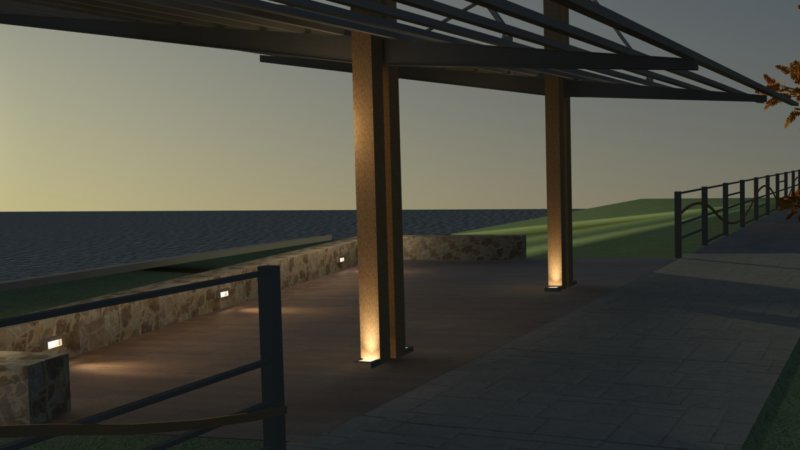 Cad64 Posted August 22, 2010 Posted August 22, 2010 I played around with this a little bit today and the render below is what I got. I used the daylight system for sunlight and I placed photometric lights at the base of the posts. I set the "Light Distribution" to "Spotlight", used the "Halogen (Cool)" color preset and set the Intensity to 50000 cd. Give that a try and see what you get. Quote