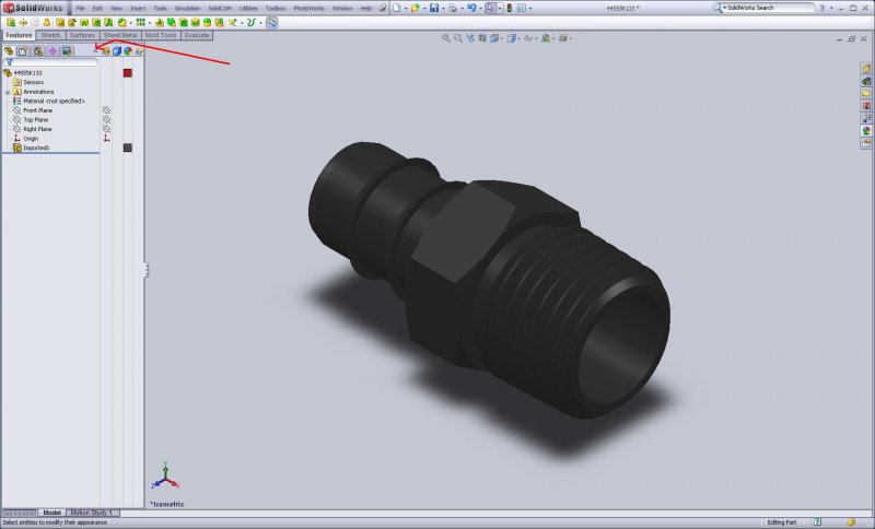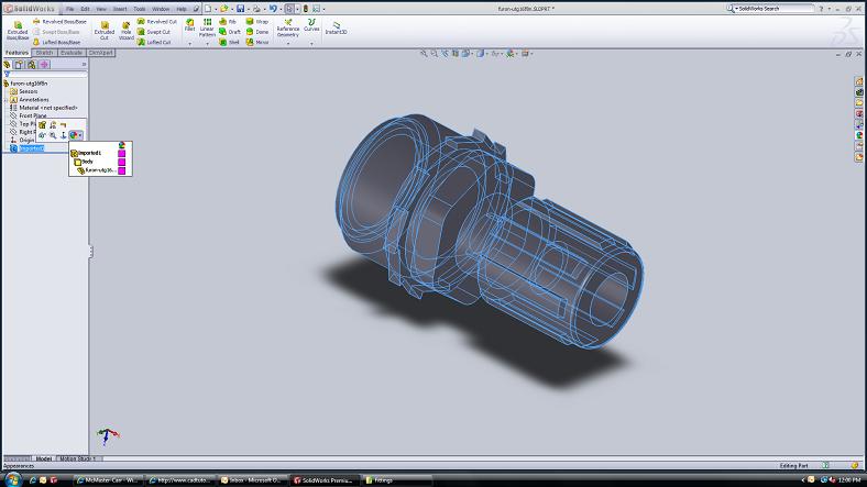 EvanH Posted September 23, 2010 Author Posted September 23, 2010 Evan,Can you attach part file? I can give it try for you.......maybe a video card glitch. Sure.... they are attached at the bottom, one as-downloaded and one saved as sldprt. Evan, expand the Feature Tree using the arrows i pointed to in the screen shot. Notice that the Appearance column has a color next to the part name and next to the imported body. The one on the imported body over-rules the one on the part name. I dont think this is the problem but double check it just in case. No color box next to Imported1 on the expanded feature tree: I can change the color of one face at a time, no problem. By clicking on this square, for example, and then selecting a new color: fittings.zip Quote