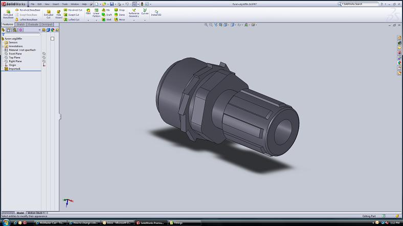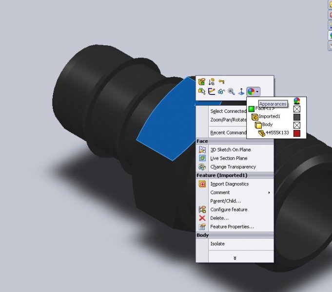 EvanH Posted September 23, 2010 Author Posted September 23, 2010 shift -- Thank you very much for the reply. This is exactly the problem though, I cannot get the color to change by doing that. Here's a screenshot (part is now resaved as .sldprt) ... I changed all the boxes in that appearances drop down box to magenta, but the part remains grey. It looks like the problem is, when I click on "Imported1" in the feature manager, the edges of the part become highlighted. For any other part, when I do that, the surfaces become highlighted and the color change works. Quote