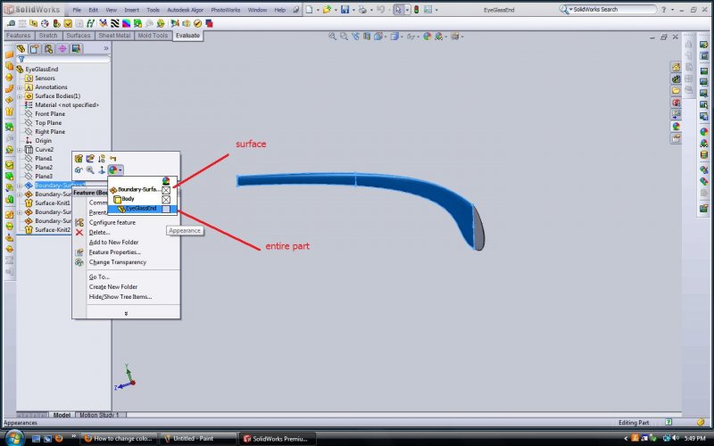 shift1313 Posted September 22, 2010 Posted September 22, 2010 If you right click on the name of the part file at the top of the feature manager or really any component, then click on the appearance red/blue/yellow/green sphere you should get a list of available things to change. Depending on your part or parts this list will be different. BUT it will show you the current surface or solid body, all bodies, the entire part and so on. That should take care of it. If not let me know. Quote