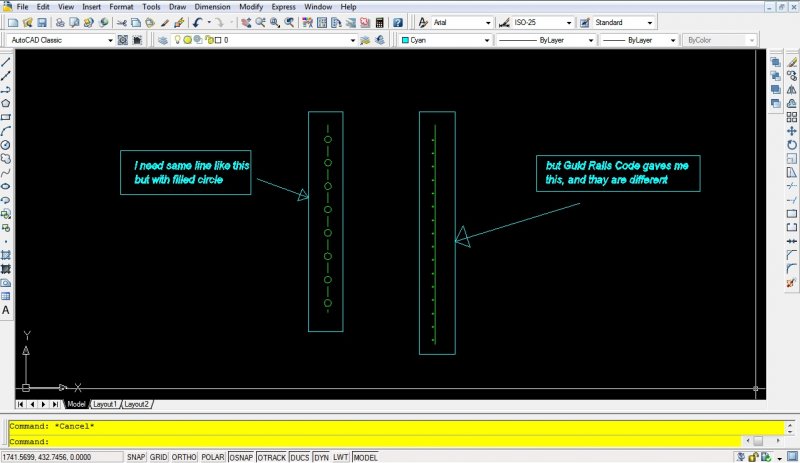 saiedmehdipour Posted September 25, 2010 Author Posted September 25, 2010 Dear Friends Tanx so much again, i changed some parameters of above code as below: *GUIDE_RAIL_2,___0____0____0____0_____0_____0__ A,0.50,["\U+25CF",arial,x=-.1,y=-.125,s=.34],0.20 the result became : if u attaention it is a continious line with filled circule, but i need DASH with filled circle; Can u help to modifying of code to grant object. B.W Quote