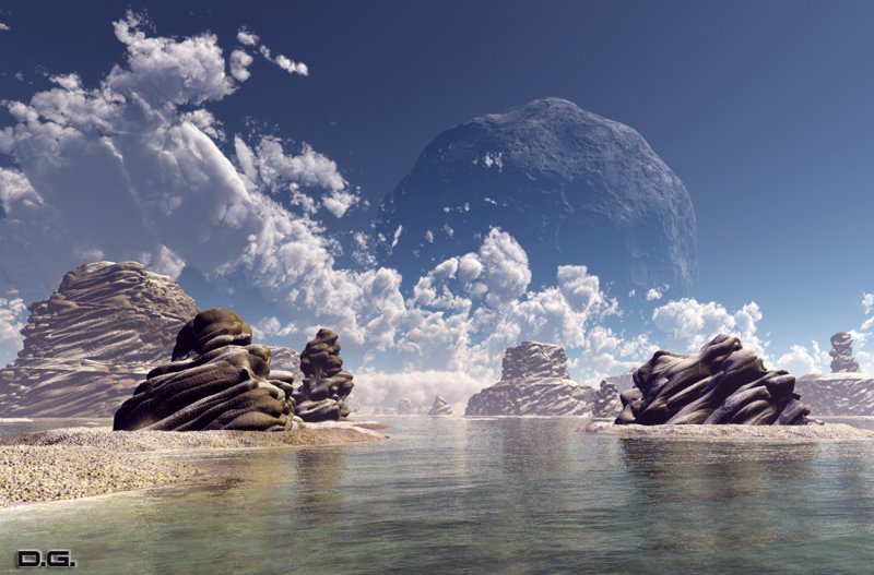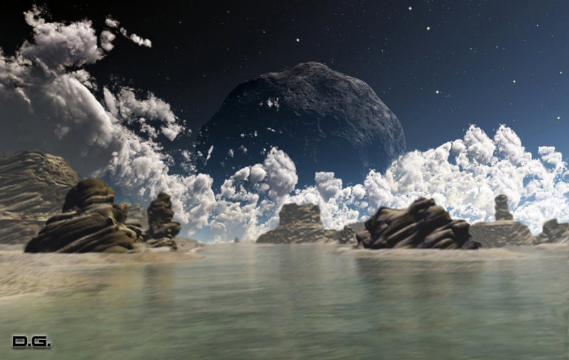 Danny Posted October 22, 2010 Author Posted October 22, 2010 (edited) Finished piece, darkened the atmo, re-rendered the clouds Postwork - added star field, brushed out the clouds, some motion blur to the terrain and water to simulate an incoming impact/shockwave. Thats it tired of looking at it Edited October 22, 2010 by Danny addition information Quote
