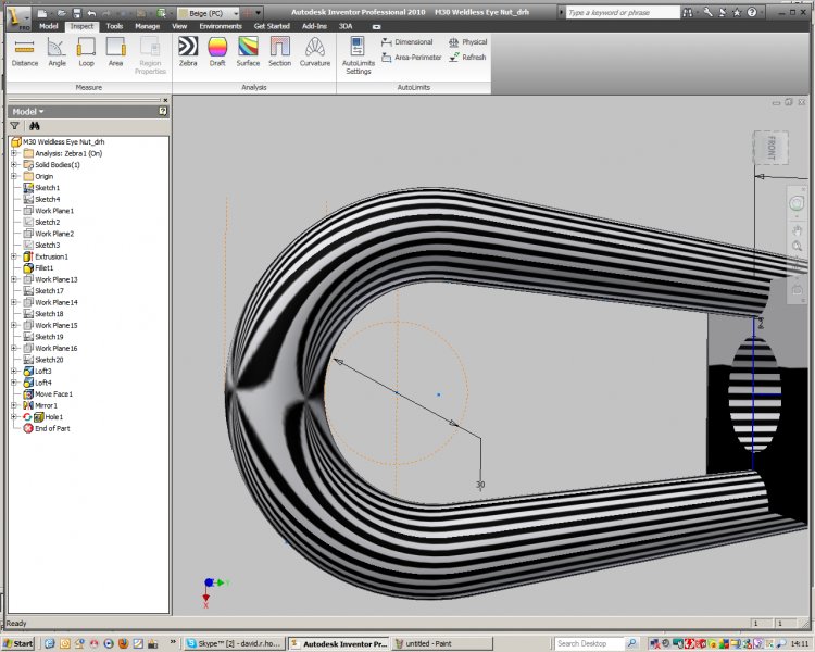 CAnnondale Posted November 23, 2010 Author Posted November 23, 2010 Hi again, Just had a few seconds spare and revisited your file. Whilst I was working on another project it occured to me that you had created the screw thread by revolving a cut and then applying the thread. A much better way of doing this is to use the "hole" generator - I just created a sketched point on the bottom surface and selected an M30 threaded hole to be created on that point. Try this out and view all the options available to you. It can be used for applying several holes at one go. I also adjusted the tangency of the second loft where it meets the first and checked this with a "zebra pattern" - this is a good way of viewing curved surrfaces for unexpected deviations, and can be turned on and off (look at the top of the history tree of the newly attched file). Regards, Dave WOW... Thanks Dave...These is an additional knowledge to us less experienced in Inventor. u rock:D:thumbsup: Quote