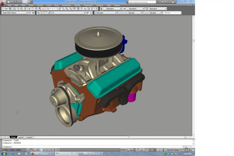 swats Posted February 5, 2011 Posted February 5, 2011 I am slowly trying to learn how to do photo realistic renderings in Autocad 2010. I am working with a model of a Chevrolet small block engine I found online. I assigned my materials to the different parts of the engine. When I render the file some the materials have been switched (for example the fan belt looks like aluminum). I have my materials assigned by my layers (I used the materialattach command). The valve covers, timing cover, and water neck should be chrome. The block should more of a hugger orange. The water pump, pulleys, intake manifold, and air filter base and lid should be aluminum. The belt, distributor, exhaust manifold should be flat black. And the air filter element and oil filter should be white. Any ideas? Quote