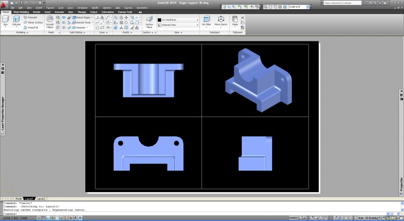 ReMark Posted February 18, 2011 Posted February 18, 2011 This is an example of the use of MView in a paper space layout. I used the options "4" and "Fit" to create the four viewports and fit them to an ANSI B (11.00x17.00) sheet. Each viewport is the same scale. Since the object, an auger support, was fairly small to begin with I could use a scale of 1:1 for my viewports. I've elected to show a top, front, right side and SE isometric view. I could have gone with other choices if so desired. Quote