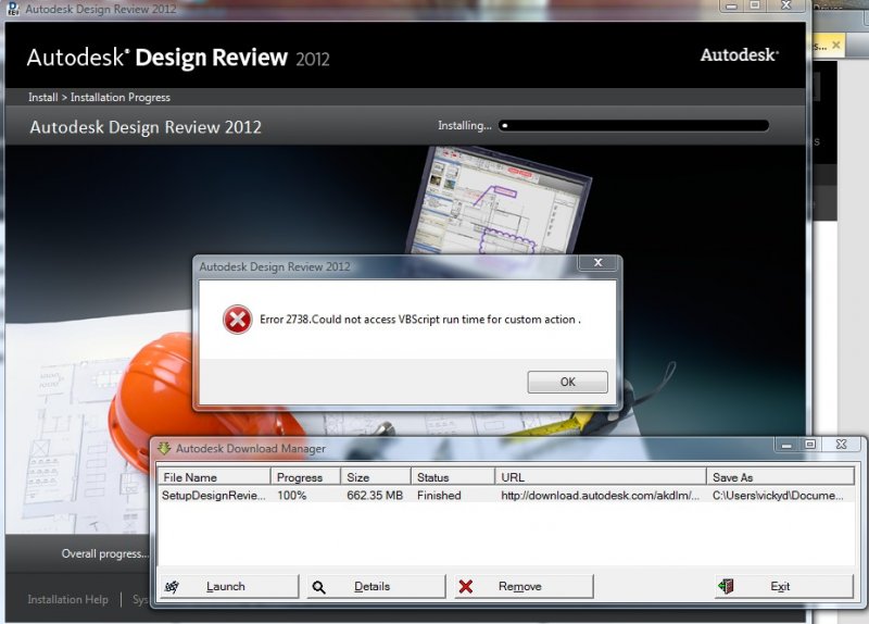 vickyd Posted September 15, 2011 Author Posted September 15, 2011 Well I tried the link "ReMark" suggested (btw Thanks!) and followed the instructions. I unregistered the 'vbscript.dll' successfully & then registered as administrator 'vbscript.dll' successfully, did a reboot. I've downloaded the "SetupDesignReview2012_bundle" (678,246 KB file) successfully and went to install & it came up with the same error....see attached Can any one help me please? my os is vista 64-bit.... Quote