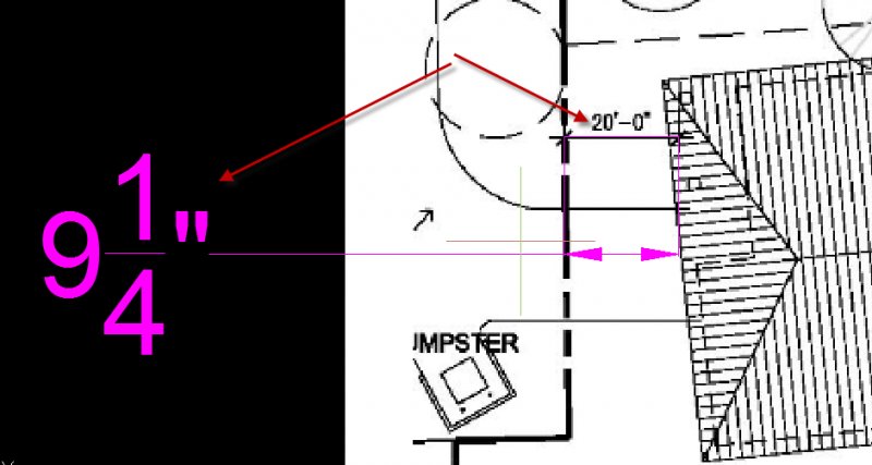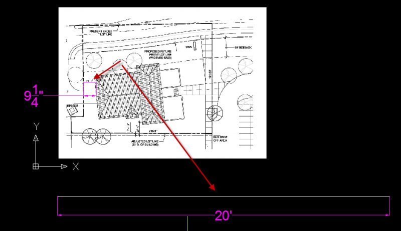 kencaz Posted October 9, 2011 Posted October 9, 2011 First image: known distance of 20' equals 9-1/4" however the 9-1/4" is irrelevant here... Second Image: Line is drawn actual 20' Using (S)cale ®eference and selecting the entire image I will make the 9-1/4" (reference line) 20' Third Image: Now reference line and the image dimensions match... Quote