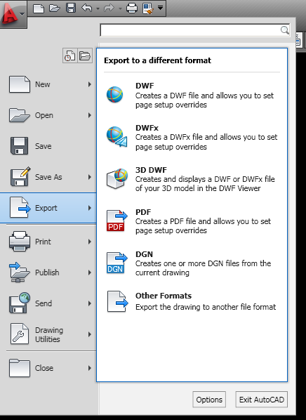 ReMark Posted October 20, 2011 Posted October 20, 2011 When I open that Export option that you have shown in your image I see options for DWF, DWFx, 3D DWF, PDF, DGN, FBX and Other Formats. If I click on Other Formats the Export Data window appears. In the drop-down list at the bottom there are several other file type options available such as BMP, SAT and WMF. DXF is not on the list (sorry if I may have given anyone the impression that it was) but there is an option to export as a Block in DWG format. Quote