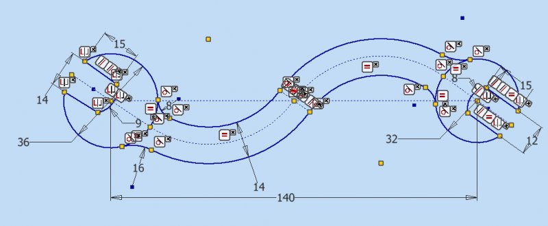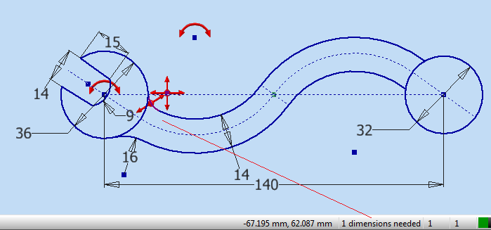 JD Mather Posted October 23, 2011 Posted October 23, 2011 (edited) Make centerline tangent to centerline arcs. Offset on either side by half distance. The easiest way to get the solution is to use Geometry Constraints (I think these were first added in 2010 or 2011) and Parametric Dimensions. Here is a picture in a next-generation MCAD program - notice that it tells me I am missing the radius dimension of this fillet and shows remaining degrees of freedom in the geometry with the missing dimension. (there is also a color change from purple to blue that isn't as evident from this zoom level) Edited October 23, 2011 by JD Mather Quote