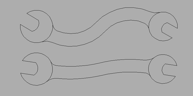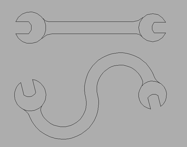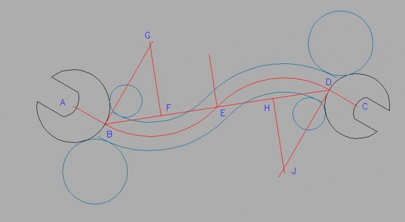 eldon Posted October 23, 2011 Posted October 23, 2011 This is how I drew it (there are probably other ways, but this gets it done) First draw the end shapes with the jaws horizontal. Then put them at 140 apart. Then I rotated each -30 degrees about their cetre points A and C. Next draw lines AB and CD which are parallel to the jaws. These are the points where the connecting shape comes out at right angles to the circle. Then draw line BD and split it at the mid point E so there are two lines BE and ED. Next draw the perpendicular bisector FG and also a line perpendicular to AB to G. This is the centre of the arc. Similarly draw HJ and then DJ. Using the Start, Centre, End option of Arc, draw the arc B to E, and D to E. Now offset these lines by 7. To finish the arcs at the shoulders, I drew circles using the TTR option, and to tidy up, I trimmed and erased the construction lines. Quote