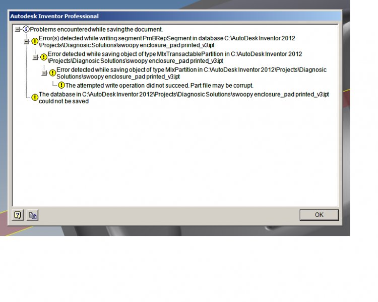 Hopinc Posted November 11, 2011 Posted November 11, 2011 Hi Guys, It's been a while since I have been on the forum due to pressures of work, but an issue with Inventor 2012 has drive me to making this post. Every now and then I get this error message when I try to save a model. Has anyone else experienced this and is there a cure? At least for me, Inventor 2012 is nowhere near as stable as 2011 - that is once the render crashing bug was sorted. Regards all, Dave Quote