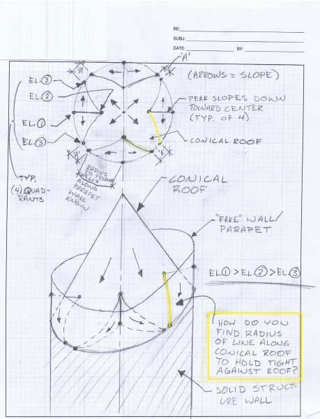 rwhitt0724 Posted November 11, 2011 Posted November 11, 2011 Hello everyone. I have started a project and have a somewhat unusual condition. I know this is not a detailing site, or an engineering site, but I figured there are some smart fellows on here that may be able to give a little input to this. I have a structure with a Conical Roof. We are putting a parapet around this roof. With the parapet, we are also going to create 4 individual structures that direct water/rain flow to scuppers that will be fabricated into the parapet. Below is a sketch of our condition. I was wondering if anyone knew how to get the shape of a line that follows the face of a cone. Obviously, this line is not projected to the center of the cone, so it is not just a straight line. I am imagining either a radial cut piece, or a complex/multiple radial cut piece. I don't really know how to put it into words exactly.... Take a look at the sketch and ask away. Also, if anyone knows a website where I may be able to do a little more research into something like this that would be great. Anyways... Here you go... Quote