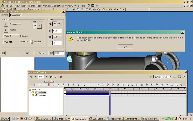 shift1313 Posted October 23, 2008 Posted October 23, 2008 sorry bikeguy as i am probably not the best reference for this, but when i animate components like the thread/nut i did above, i expand the drawing tree on the left, right click on the constraint i want and use the animate constraint button. The error you received above means you are trying to animate the same constraint in two different ways at the same period of time. The animate component is what i would use if you were say bringing that nut in from a distance away from the part. The inventor studio that i use is typically what you would use to check motion simulation of an assembly(i think) and check for clearance issues. The presentation file is like you said what you would use to show assembly(i think). When trying to move two components at once you just need to make sure their times overlap. This should work as long as they are not the same component. ill check those videos out later today and reply back. Quote