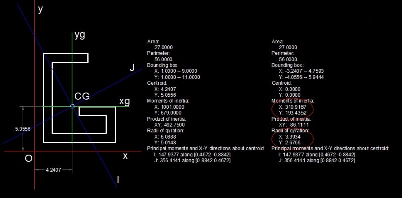 Stefan BMR Posted December 24, 2011 Posted December 24, 2011 Hi Bill About 2% differences, is the shape double symmetric? If it's not (and you can see that next to Principal Moments, if directions are different than [1.00 0.00]) then you need another method to get the correct values. I know two methods: 1) First, run _massprop and collect the centroid coordinates; then set UCS to centroid. Run _massprop once again and compare Moments Of Inertia (and not Principal moments) with AISC manual. 2) Second method required to run _massprop once and no UCS settings: - read area A - read centroid from _massprop - (xg, yg) - read Moments of Inertia - (Ix, Iy) The moments around centroid an parallel to x and y axis: Ixg = Ix - A*yg^2 Iyg = Iy - A*xg^2 Radii of gyration: rxg = sqrt (Ixg / A) ryg = sqrt (Iyg / A) See the picture. First results are around WCS axis and second around Center of gravity. Quote