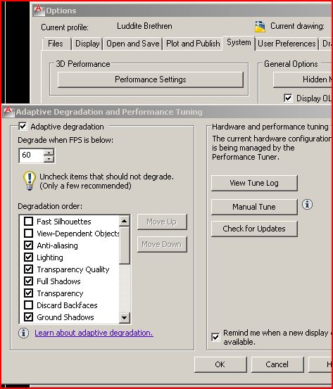 Dadgad Posted January 13, 2012 Posted January 13, 2012 I notice that if I have several drawings open my AutoCAD slows down quite abit. This also happens if I have AutoCAD open and I open several drawings one at a time. I looked for the paging file but I cannot find it to adjust the max size. Is this where I should be looking and if so how do I get there? If I shut down AutoCAD and restart it the program works faster for the first few drawings. My machine has been upgraded to 6 gig of ram and the OS is Windows 7 pro. Do you use adaptive degradation? Probably not going to make a huge difference, but it might help keep your speed more consistent. And what is your incremental save percentage set to? Quote