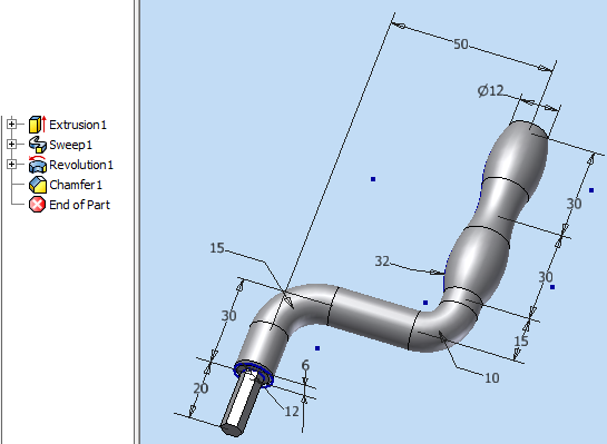 JD Mather Posted February 18, 2012 Posted February 18, 2012 (edited) Extrude, Sweep and Revolve. Extrude the hex. Sweep the S-curve. Revolve the handle. Finish with chamfer. One of the dimensions is incorrect. Arcs should be dimensioned as R not Ø and I suspect when the mistake was made the value was halved. Edited February 18, 2012 by JD Mather Quote