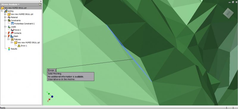 ewachoy Posted March 6, 2012 Posted March 6, 2012 Hi all, i'm newbie in inventor. i had got this skull model in .igs format. then i imported to inventor version 2012 with option in single composite features. so now i guess the skull model is in one part. Q1: however the model still in transparent which im not sure if this will affect what im going to do in stress analysis. how do i fix the transparent model? Q2: i try to repair the model by entering the repair mode. i manage to find those errors but i cant repair using 'heal errors' button. n i tried to stitch also wont work. how do i repair this model? this is the errors shown: Q3: eventually i wanted to do stress analysis for my skull model. i can assign materials but other steps like constraints, load, are unable to to select the surface that i want to do simulation. it just cant click on the surface which i dunno why. how do i solve this prob & can proceed to the stress analysis? Hope you guys can help me out as this is my final year project for my bachelor degree. I really in need of these solutions. Please help me!! Thousands thanks in advanced!!!! Quote