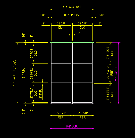 Jack_O'neill Posted March 10, 2012 Posted March 10, 2012 The subject of this discussion is why there are usually 2 sections in each file....one folder labeled "design" and one "as-built". I don't do much residential stuff, almost all of my work is on commercial buildings, and 90% of what I do are the curtain wall elevations and details. These elevations are generally dimensioned like this: Curtain wall is a little strange, and follows it's own path, but nearly everything gets dimensioned more than once so that there's no question about where it should go. OD in this case means "opening dimension", not outside diameter. FW is frame height, AR is "architectural reference". As you can see, the actual framing members are measured from the outside of the first to the centers, then to outside of the last. DLO means "daylight opening" and means just that...it's the amount of space daylight can pass through. The 3/8 dims you see at the top and bottom and each side is the caulk joint that goes all the way around the system. Confused yet? Quote