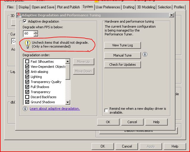 Cad64 Posted April 6, 2012 Posted April 6, 2012 So what happened a few days ago? Did you have a computer crash while the file was open? What video card do you have? In Autocad's performance settings, Do you have hardware acceleration enabled? Are the previous versions of the model also 13mb, or are they a smaller filesize? Can you post some screenshots so we can see what you see? Quote