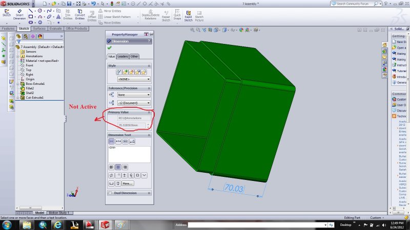 JD Mather Posted June 24, 2012 Posted June 24, 2012 Notice that your dimension is in parenthesis. This means it is a driven dimension, not a driving dimension. Edit Boss Extrude1. What does it show? Edit Cut Extrude1. What does it show? (you edit by right clicking on the node or double click) Quote