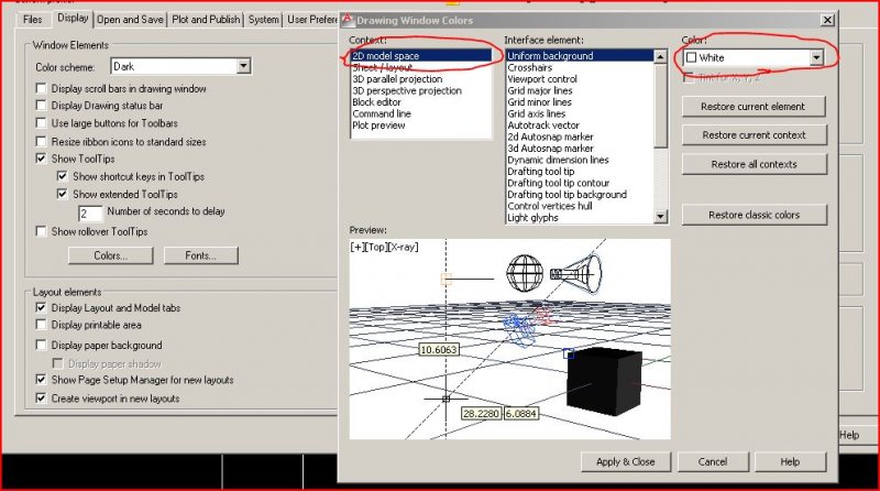 Dadgad Posted June 27, 2012 Posted June 27, 2012 OPTIONS > DISPLAY tab COLORS Don't forget to APPLY & CLOSE after you make the changes you want. Quote