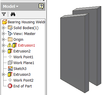 JD Mather Posted August 15, 2012 Posted August 15, 2012 Le't start with the basics. Notice that there is a problem with your Extrude1. Right click on it and Delete it. Delete everything after Extude2 (not needed). In the real world this would be one part number placed two instances in the assembly. Model it that way. one ipt = 1 solid body, not 2 (until more experienced, then we'll talk about multi-body solids to make the entire thing easier). Edit Sketch2 - it doesn't have enough dimensions to manufacture. I recommend you start here http://home.pct.edu/~jmather/SkillsUSA%20University.pdf Once you have fixed the part - attach here. Then we can see how to apply assembly constraints. Quote