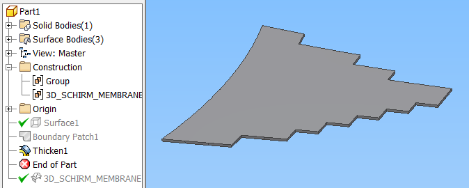 hfs Posted August 30, 2012 Posted August 30, 2012 Hello! I have a 3D geometry in .dwg format ... it is a part of an umbrella membrane structure (see the attached pic.) This geometry is divided into litte pieces. Each piece is a '3D surface' object I need to give this umbrella a thickness! I tried Extrude command; Error! the surface object should be planner I tried surface offset command as explained here http://autocadinsider.autodesk.com/my_weblog/2010/12/offsetting-surfaces-in-autocad-2011.html did not work cuz my object is not a planner surface nor a extruded surface so... what to do experts?! Thanks a lot in advance! Quote