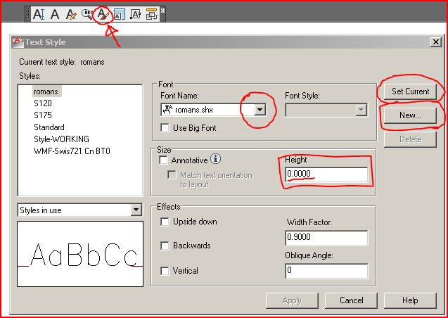 Dadgad Posted September 20, 2012 Posted September 20, 2012 If you look on the TEXT toolbar in the image I have circled the icon you want to use. Once you have set up your NEW text style, leave the HEIGHT set to 0, or you will have problems with it later, then SET CURRENT, and you should be good to go. The fonts dropdown arrow lists all of the fonts which are already available in Autocad. Quote