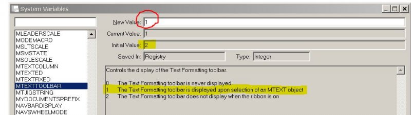 Dadgad Posted October 4, 2012 Posted October 4, 2012 As the Ribbon has contextual states built into it, and so is constantly changing driven by what you are doing, I am not sure how to do that. Do you display your MENU BAR above (or below) the ribbon? I ask because one of those is FORMAT. If you click on the circled arrow on the right hand end of the top line, you can select SHOW MENU BAR. If you do that, at least you will always be able to directly access the dropdown list of FORMAT related commands. Are you specifically interested in this, as it pertains to editing MTEXT? If so, then look at the other image, and set your MTEXTTOOLBAR variable to 1, so that your mtext editor will display while using the ribbon (the default value is 2). Quote