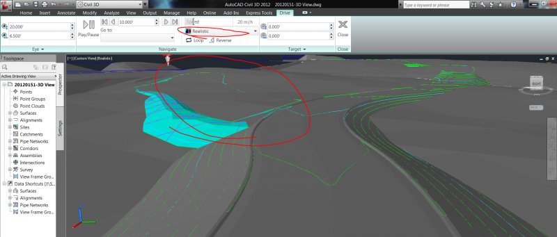 tcaruso Posted October 17, 2012 Posted October 17, 2012 Hey guys, Issue: Visual Style is rendering the surfaces differently when I try to use the "Drive" function. Drive is under Workspace: Civil 3D, Analyze, Design, Visibility Check, Drive. My end goal is to use a screen recording program to record the drive down my propose road, developers love that stuff!! If you will notice, in both images I have 'Realistic' visual style chosen, yet the surfaces render differently. I want the proposed pond, circled in red, to show as the iso view does (a hole in the ground), not as the drive view does. ANY IDEAS WHY IT RENDERS DIFFERENTLY? and how to fix this issue? Quote