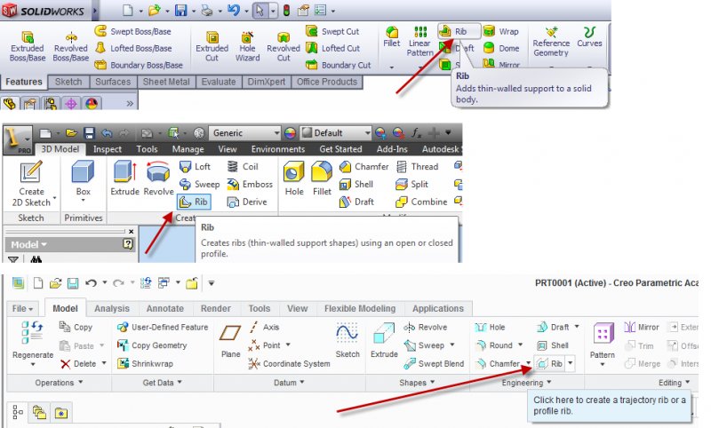 JD Mather Posted November 6, 2012 Posted November 6, 2012 In the three MCAD programs I use, SolidWorks, Autodesk Inventor and Creo Parametric (Pro/E) that feature would be created with the Rib tool. I prefer to use the same terminology that the software uses. I would use the term "gusset" for a supporting part in a weldment - the gusset is a part itself in an assembly of parts welded together. Quote