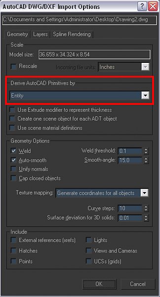 Cad64 Posted November 12, 2008 Posted November 12, 2008 I just re-read your question and realized that you have separate objects in your Cad file. If you want your Autocad objects to be separate objects after Importing to Max, then make sure to set your "Derive Autocad Primites by" Import option to "Entity". See below: Quote