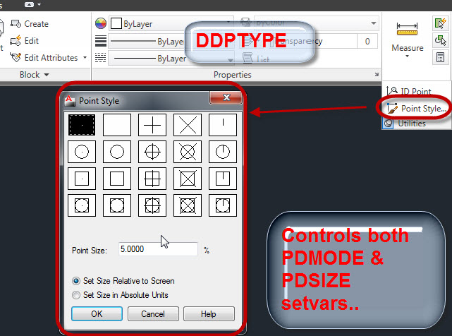 troggarf Posted December 18, 2012 Posted December 18, 2012 DDPTYPE is a command that lets you controls what type of Points are displayed and their size which is controlled by the PDMODE and PDSIZE system variables. This can be launched in the command line or found on the Home tab > Utilities panel (dropdown)... Also note that the size can be an absolute size or relative to your screen Quote