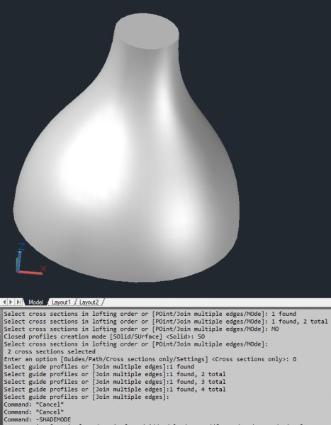 spinecad Posted March 6, 2013 Author Posted March 6, 2013 Why would you not use Revolve - the easiest way to do this.Didn't you earlier insist in another thread on creating a pyramid the hard way? Ah yes, I found it http://www.cadtutor.net/forum/showthread.php?77745-Convert-Surface-To-Solid-in-AutoCAD-2002-Is-It-Possible Is this some kind of class challenge? In 2012 you could use the Loft command. [ATTACH=CONFIG]40682[/ATTACH] I use the Loft command. When asked to select the cross sections, I select both circles. Then the shape is formed and looks different. I remember asked a Path and Guide. But why now those are not available anymore Quote