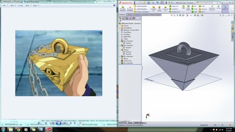 Agent Q Posted April 5, 2013 Posted April 5, 2013 Hey guy's!! I'm practicing my rusty Solidworks skills by modeling the Millennium Puzzle from yugioh. However I'm having a heck of a time trying to extrude the caps on the four corners of the puzzle: I've just discovered that you can't extrude a 3D sketch and I need some advice. Any ideas? Millennium Puzzle - Pyramid.SLDPRT Quote