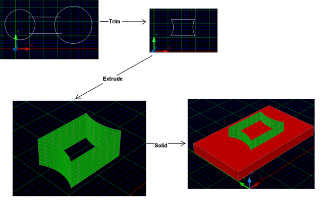 Chris74 Posted July 1, 2013 Posted July 1, 2013 I've just started learning AutoCAD and came across my first obstacle I don't know how to work around. I hope someone will help me with it. Here's what I'm trying to do. I draw two lines and two circles and then trim the excessive parts as in the picture (in general it can be an area composed of various types of lines, straight lines, arc, and likely with rounded corners). Then extrude to the height 2. This makes 4 surfaces (green). Now I build a solid 'around' the surfaces. In this example I draw a rectangle and extrude to the height 1 (red). And my question is: how do I remove the part of the solid that's enclosed within the green surfaces? Subtraction doesn't work as I don't subtract solid. Slicing doesn't work either as it's more than one surfaces. For the same reason I can't turn it into a solid. Any help will be appreciated. Quote