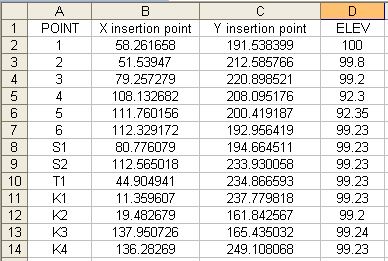 eldon Posted August 12, 2013 Posted August 12, 2013 And this is what the data looks like, with a column for description. POINT,X insertion point,Y insertion point,ELEV,DESC 1,58.262,191.538,100, 2,51.539,212.586,99.8, 3,79.257,220.899,99.2, 4,108.133,208.095,92.3, 5,111.760,200.419,92.35, 6,112.329,192.956,99.23, S1,80.776,194.665,99.23, S2,112.565,233.930,99.23, T1,44.905,234.867,99.23, K1,11.360,237.780,99.23, K2,19.483,161.843,99.2, K3,137.951,165.435,99.24, K4,136.283,249.108,99.23, Quote