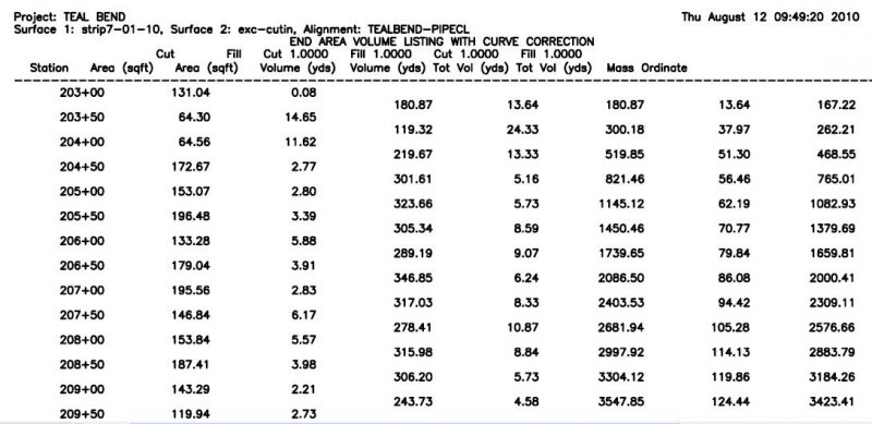 Organic Posted August 16, 2013 Posted August 16, 2013 I am trying to calcuate the volume that was cut at each 100' station and create the table (below), but not having any luck. I think its under the terrain menu. I know how to get the volume for the whole thing, but the problem is the topo only picked up shots every 100' so the volume would be bogus since it just interpolates between these 100' stations. You've got the cross sectional area of cut and cross sectional area of fill at each 100' station. That is, in relative to each other, the amount of cut/fill that occurred. To convert it to a volume, multiply it by an arbitrary unit length, e.g. 1'. That is the best answer you will be able to obtain if your survey simply doesn't have enough data except at the cross sections. Quote