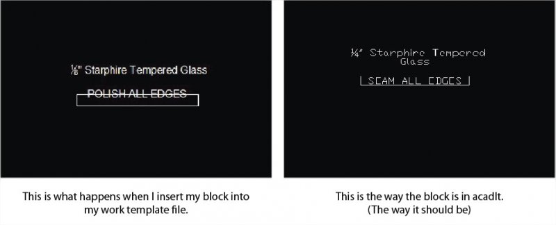 vpatterson Posted October 17, 2013 Posted October 17, 2013 I have been working on blocks to help improve our production drawings at work. I created the blocks in the default template acadlt and it works fine, but if I import it into my work template the block doesn't import correctly. My work template file can be found on this link http://www.cadtutor.net/forum/showthread.php?79175-I-d-like-some-constructive-criticism (Its my bosses Thread). I will post images to show you what the block does when inserted please help. Quote