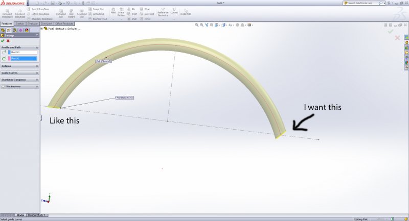 jeffunik72 Posted December 7, 2013 Posted December 7, 2013 Hi all, ive run into a problem in solidworks.. im trying to create a half circle using sweep boss/base but i cannot get the ending end of the sweep to finish straight it always finishes on an angle ive posted a picture of the issue.. if anyone knows how to solve this... thanks Quote