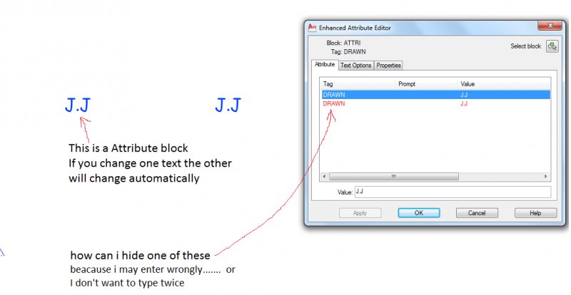 dbroada Posted December 11, 2013 Posted December 11, 2013 the thread Tuns pointed you to is still the best place to start. What you are asking for is far harder than it needs to be. There are many methods suggested on this site but they all require more manipulation than you would do by just typing the information twice. Before I saw Steven's method I had given up trying to have a replicated attribute, his way works. Incidentally, you should not duplicate attribute tag names in the same block (as you have, one in red). AutoCAD can get seriously confused, especially if you ever need to run a LISP routine on it. Quote