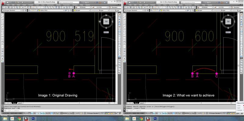 Mhooper Posted January 25, 2014 Author Posted January 25, 2014 I dont think that i explained myself very well. See attached image. Image 1: Is the orginal drawing Image 2: is what i want to achieve. In this example there is an opening in a blockwork wall. Image 1 can see the opening is set 519mm from the end of the wall. This doesnt make sense and should be 600mm. In image 1 you can use stretch move the opening from point 'A' to 'B' by adding 81mm. However this require calculation. In the firm i use to work for they used stretch to shift the door opening like in image 2. First you would use the stretch command and select the opening. Select point 'a' which then you would hit there custom shortcut then click point 'c' and type the dimension (in this case '600') this would move the opening to point 'c'. I hope that's clearer. Quote