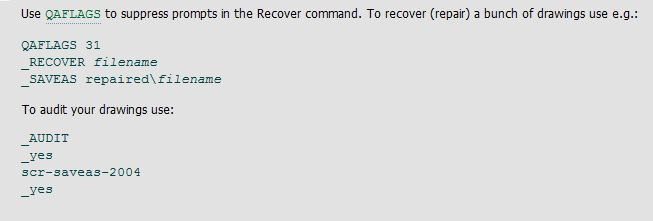 dbroada Posted March 4, 2014 Posted March 4, 2014 I have a series of drawings that need to be RECOVERed. The ideal solution would be to establish why this is so but for now it is sufficient to RECOVER them. I can do this individually which works but I have also tried to recover them as a batch. I cannot get this to work. With RECOVERAUTO set to 0 (default) it finds no errors and leaves the drawing still in need of recovery. With RECOVERAUTO set to 1 or 2 my script won't run. I am sure steady thinking may get my script running but what is the difference between RECOVER from the command line and in a script? Quote
