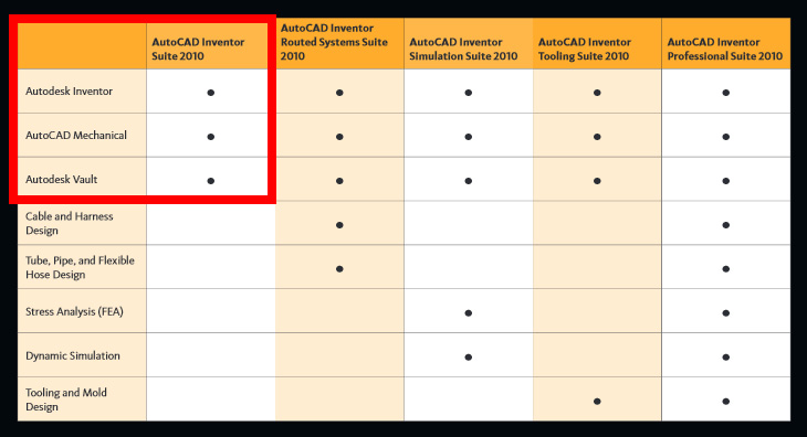 Cad64 Posted April 3, 2014 Posted April 3, 2014 (edited) I'll just leave this here ... That is a "Suite". It includes Autocad and Inventor. They are 2 separate programs. http://asean.autodesk.com/adsk/servlet/index?id=14678731&siteID=1157326 The "Autocad Inventor Suite 2010" contains Autocad Mechanical and Inventor. It looks like the OP could benefit from the "Autocad Inventor Routed Systems Suite" which includes tube, pipe and flexible hose design. Edited April 3, 2014 by Cad64 Added graphic Quote