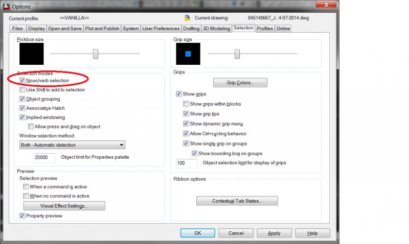 Cad64 Posted April 11, 2014 Posted April 11, 2014 check this setting That does the same thing I mentioned. Pickfirst is the variable that controls the Noun/verb selection. Changing the Pickfirst setting to 1 or 0 toggles the Noun/verb selection on and off. Quote