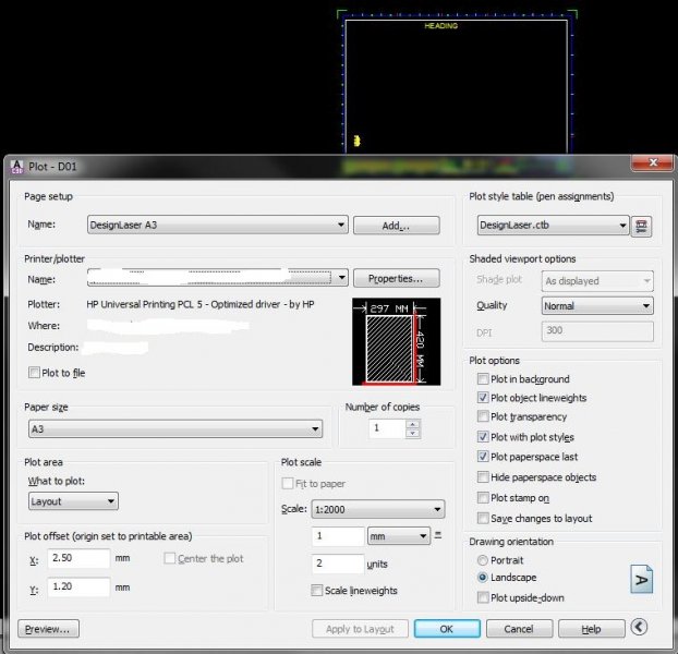 BIGAL Posted May 30, 2014 Posted May 30, 2014 A bit more we set our layouts to metric A1 about 24x36 but we plot majority as a A3 its really easy. The layout has the title block true size 841x595 a scale of 1:1 we create mviews which are scaled within ppto fit the sheet. The A3 is just a case of changing in the PLOT the scale from 1 = 1 unit to 1 =2 units and selecting the A3 paper size. Quote