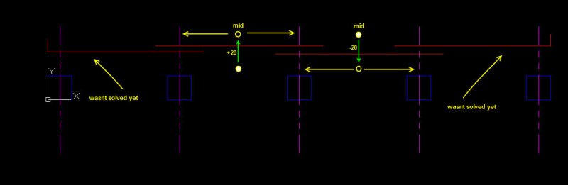 samifox Posted June 7, 2014 Author Posted June 7, 2014 ok i got it no one understand what i want...( sorry my wife gave me only 5 min ok...one picture worth 1000 words... in the attached image you can see what im trying to achieve , and hopefully my problem to set the mid point in different location each loop iteration. this is the code i manage to write , in order to solve the problem , i've created a list (list '(+ -)) , and each loop iteration im trying to call that list with (car list) and than (reverse list) , so each iteration will trigger different function. [color="red"][b](setq opr (list '(+ -)))[/b][/color] (setvar "orthomode" 1) (defun rebarseq (/ plst fstpt mdlpt endpt pinp mid clk cclk p1 p2 ang dis) (setq plst (cons (getpoint "\nPick first point") plts)) (while plst (if (= (length plst) 1) ;_if its the first iteration (progn (setq plst (cons (getpoint (car plst) "\nPick second point") plst)) (setq ang (angle (car plst) (cadr plst))) (setq dis (distance (car plst) (cadr plst))) (setq mid (getmid (car plst) (cadr plst))) (command "_point" mid) (setq clk (polar mid ang (+ (/ dis 2.0) 50.0))) ;_polar helf distance + 50 (setq cclk (polar mid (+ ang pi) (+ (/ dis 2.0) 50.0))) ;_polar helf distance + 50 (entmakex (list (cons 0 "LINE") (cons 10 clk) (cons 11 cclk))) ) ;_ end of progn (progn ;_if its not the first iteration (setq plst (cons (getpoint (car plst) "\nPick next point") plst)) (setq dis (distance (car plst) (cadr plst))) (setq mid (polar (getmid (car plst) (cadr plst)) ([color="red"][b](car opr)[/b][/color] ang (/ pi 2)) 20.0 ) ;_ end of polar ) ;_ end of setq [color="blue"] (reverse opr)[/color] (command "_point" mid) (setq clk (polar mid ang (+ (/ dis 2.0) 50.0))) ;_polar helf distance + 50 (setq cclk (polar mid (+ ang pi) (+ (/ dis 2.0) 50.0))) ;_polar helf distance + 50 (entmakex (list (cons 0 "LINE") (cons 10 clk) (cons 11 cclk))) ) ;_ end of progn ) ;_ end of if ) ;_ end of while ) ;_ end of defun (defun getmid (p1 p2) (list ;_get mid point (/ (+ (car p1) (car p2)) 2.0) (/ (+ (cadr p1) (cadr p2)) 2.0) ) ;_ end of list ) ;_ end of defun so...how to pass the + function as an argument to ((car opr) ang (/ pi 2))? hope its clear now Thanks Shay Quote